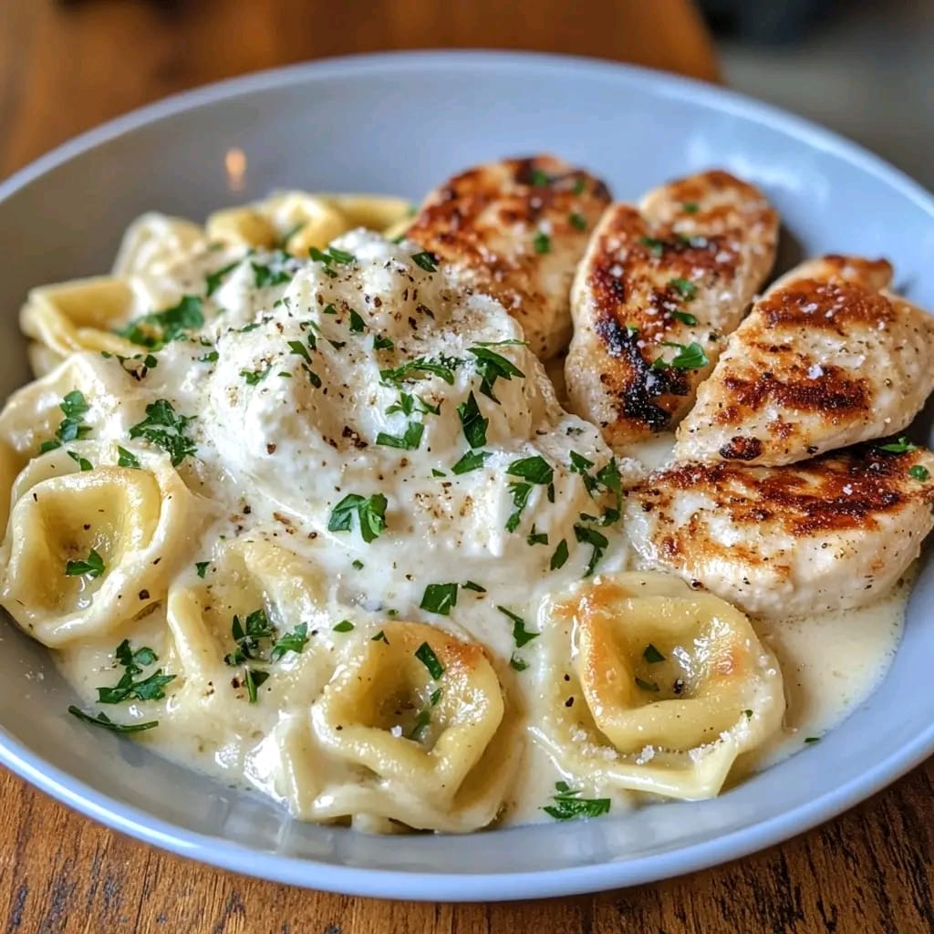 Asiago Tortelloni with Grilled Chicken in Creamy Alfredo Sauce