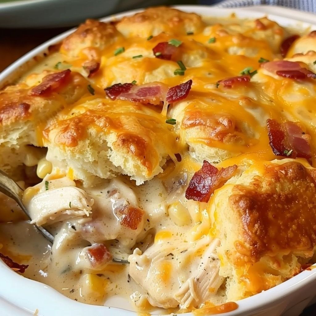 - Add Biscuits: Cut the biscuit dough into quarters and place the pieces evenly over the chicken mixture.