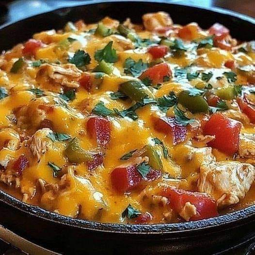 - Sprinkle the shredded cheese over the top of the chicken mixture.
