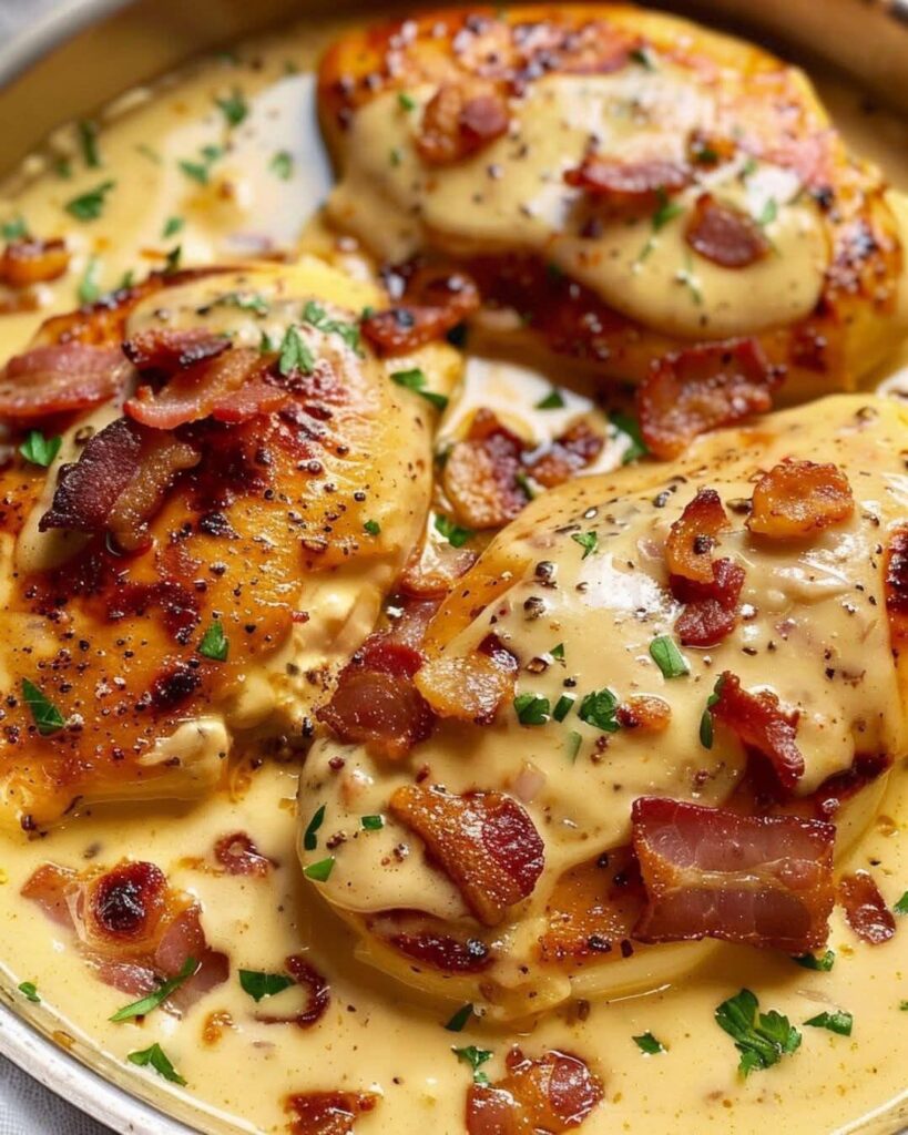 Here’s a recipe for Creamy Chicken with Cheese Sauce and Turkey Bacon that’s rich, flavorful, and perfect for a cozy meal: