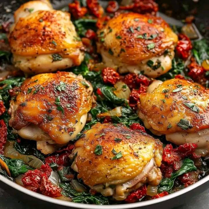 - Serve the chicken thighs over the sautéed spinach and sun-dried tomatoes, accompanied by crusty bread, rice, or mashed potatoes.