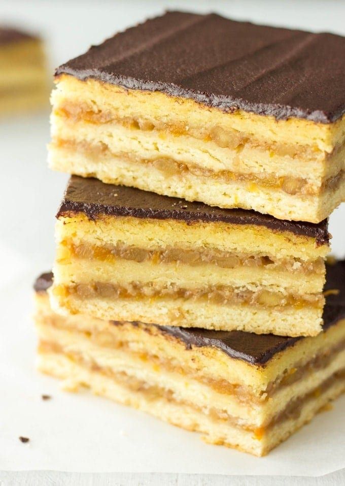 - Repeat with the second dough layer, apricot jam, and walnut mixture.