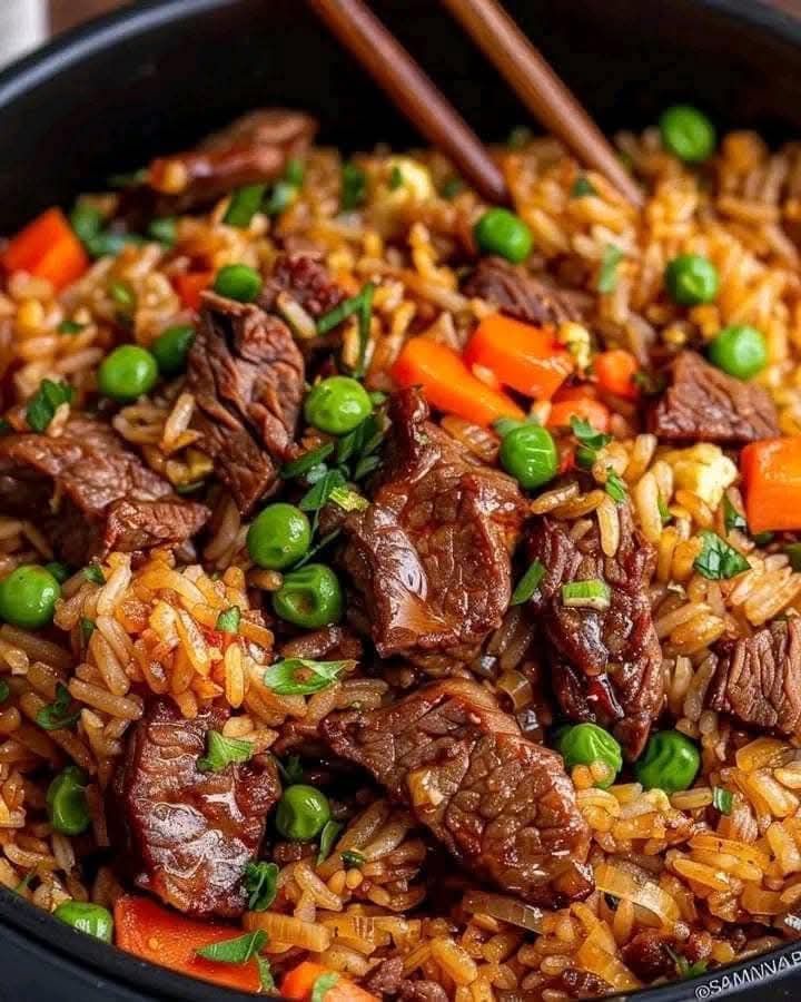 - Return the cooked beef and scrambled eggs to the skillet. Stir-fry for another 2 minutes until everything is well combined and heated through.