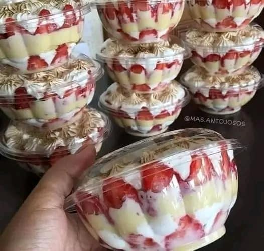 Primero ponemos media chucarada de leche condensada (opcional) luego una capa de fresas seguida de dos cucharadas de nuestra crema chantilly y repetimos hasta llenar nuestro recipiente. Al terminar refrigeramos.